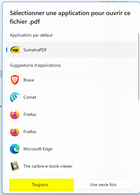 Le choix ne sera valable que pour le fichier en question et pour cette ouverture. La fois suivante, l'ouverture automatique se fera par le programme "par défaut"